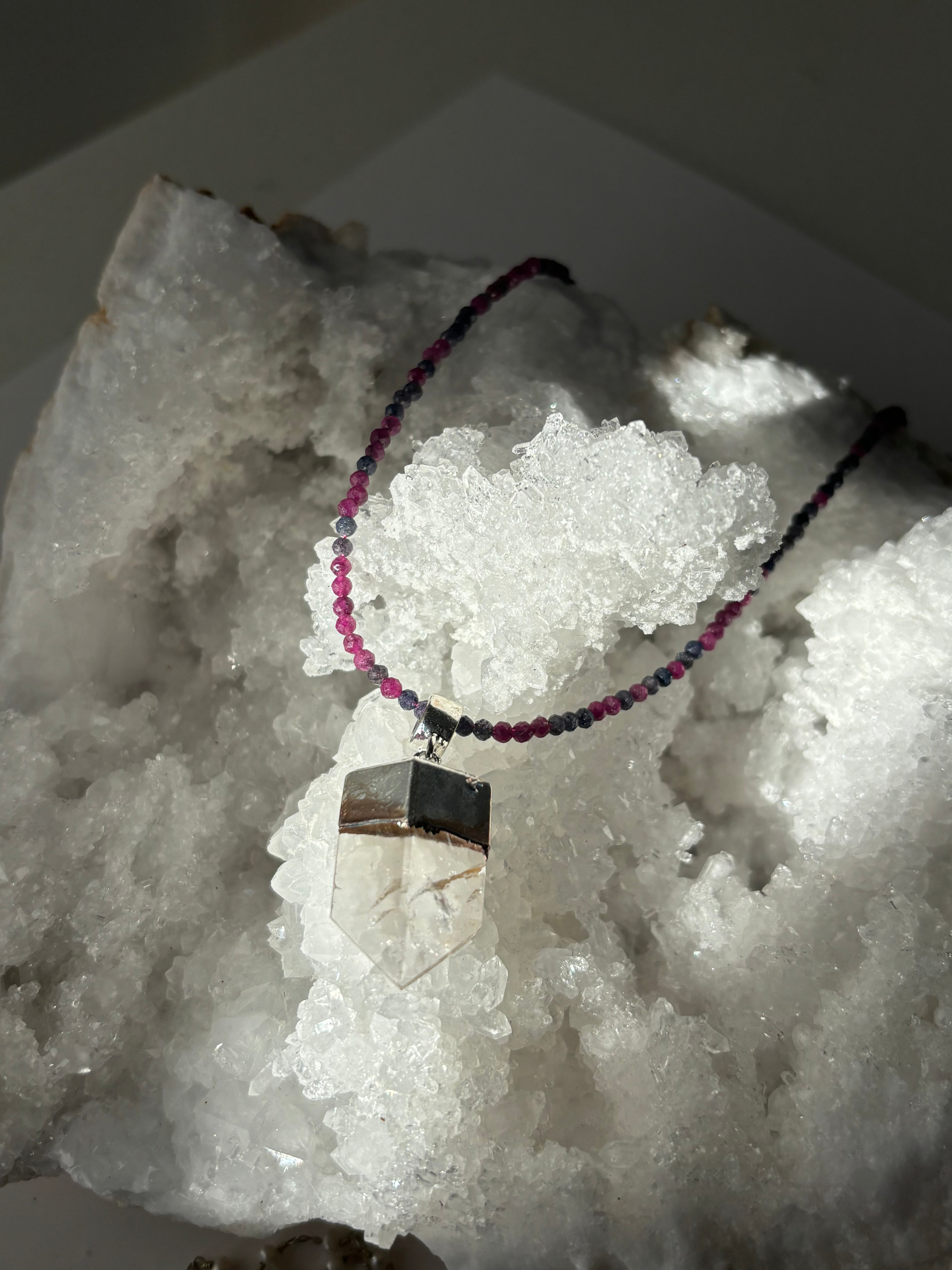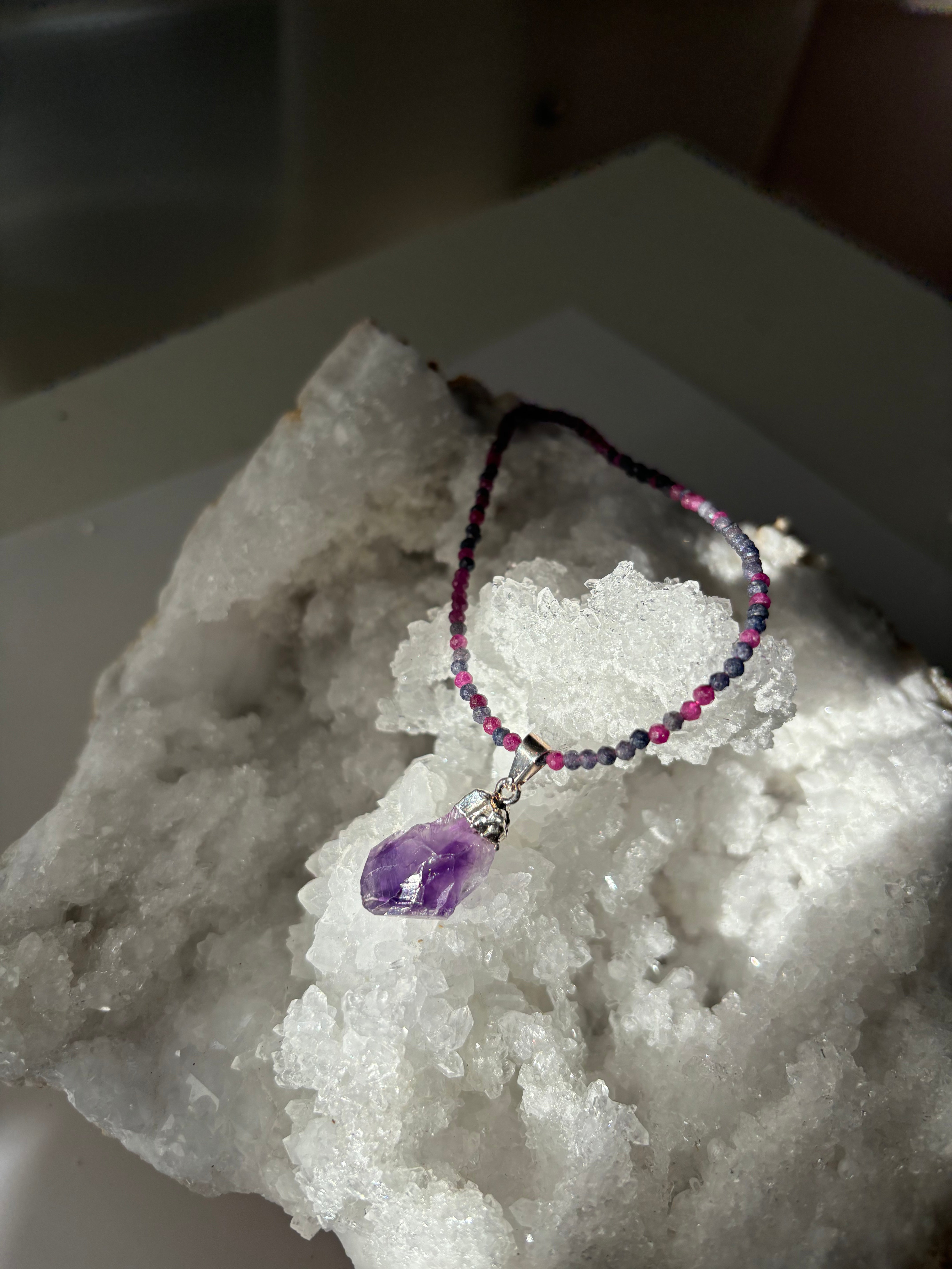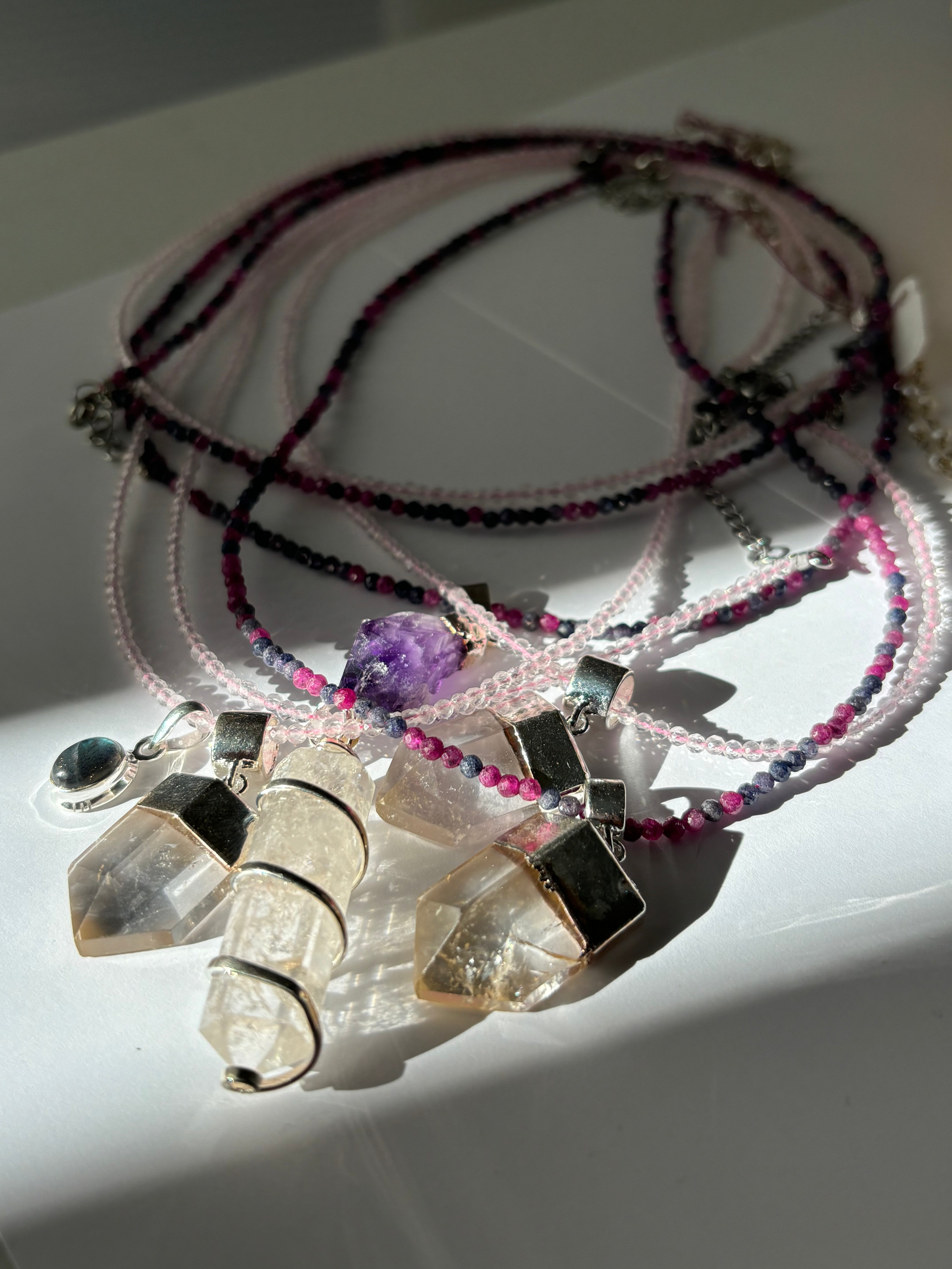 Made with high-quality materials, these necklaces feature a simple yet elegant beaded design and are available with beautiful pendants in clear quartz and amethyst. Elevate your style and energy with these timeless pieces.