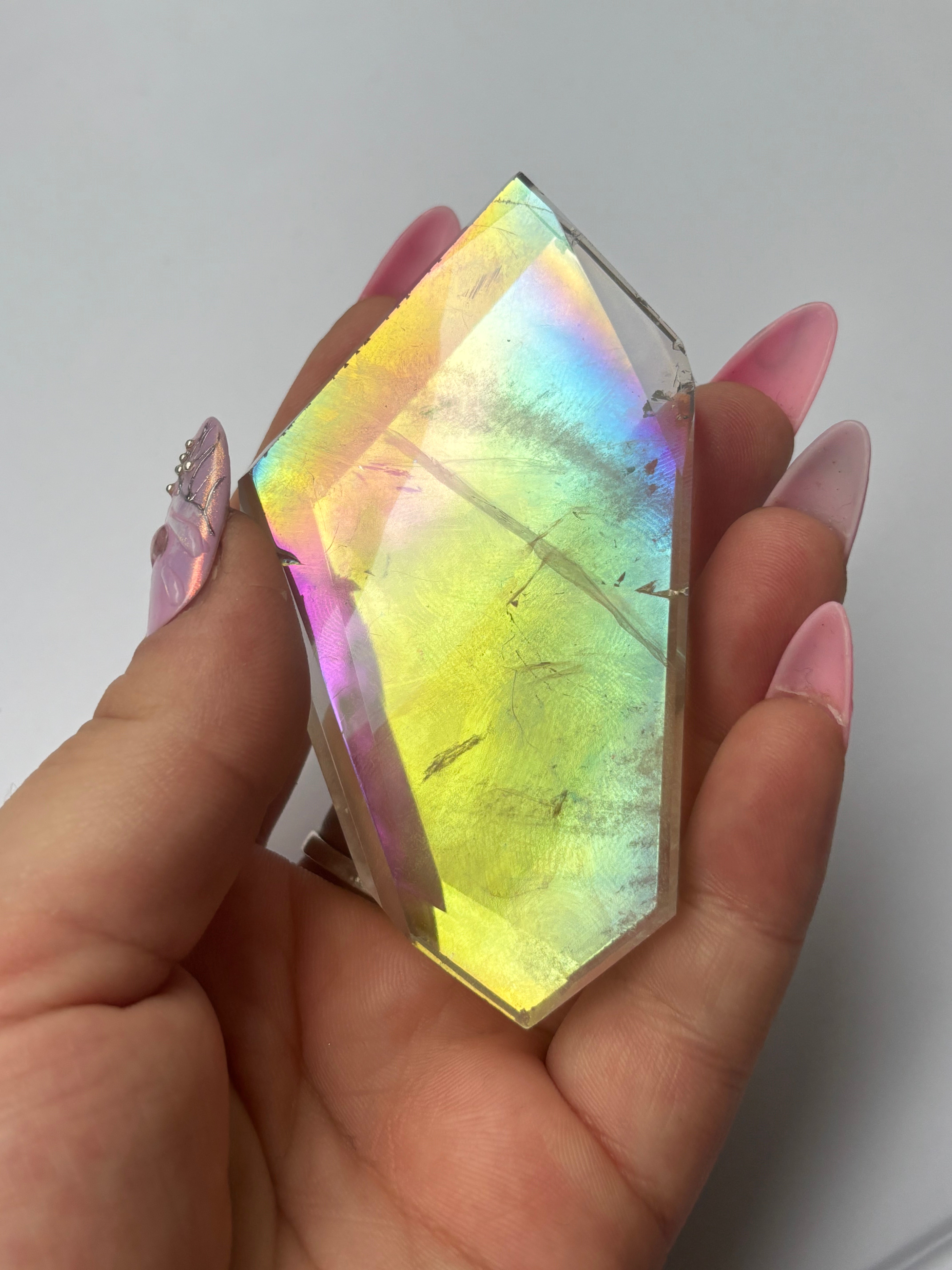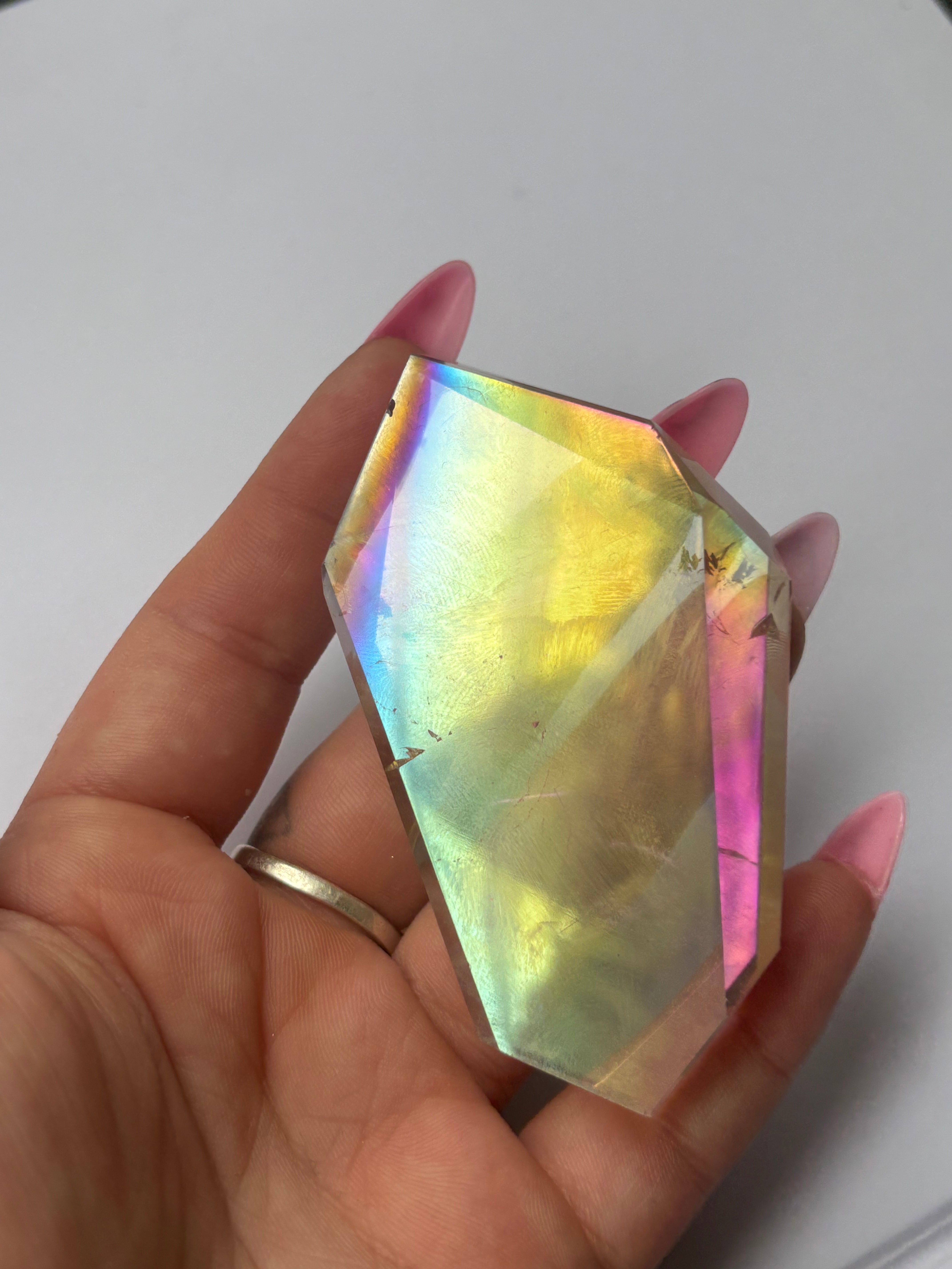 Its ethereal rainbow sheen acts like a prism for light and energy, enhancing your connection to your higher self and the angelic realms. Use it in your Reiki practice, place it on your altar, or carry it as a radiant talisman to remind you of your inner light.
