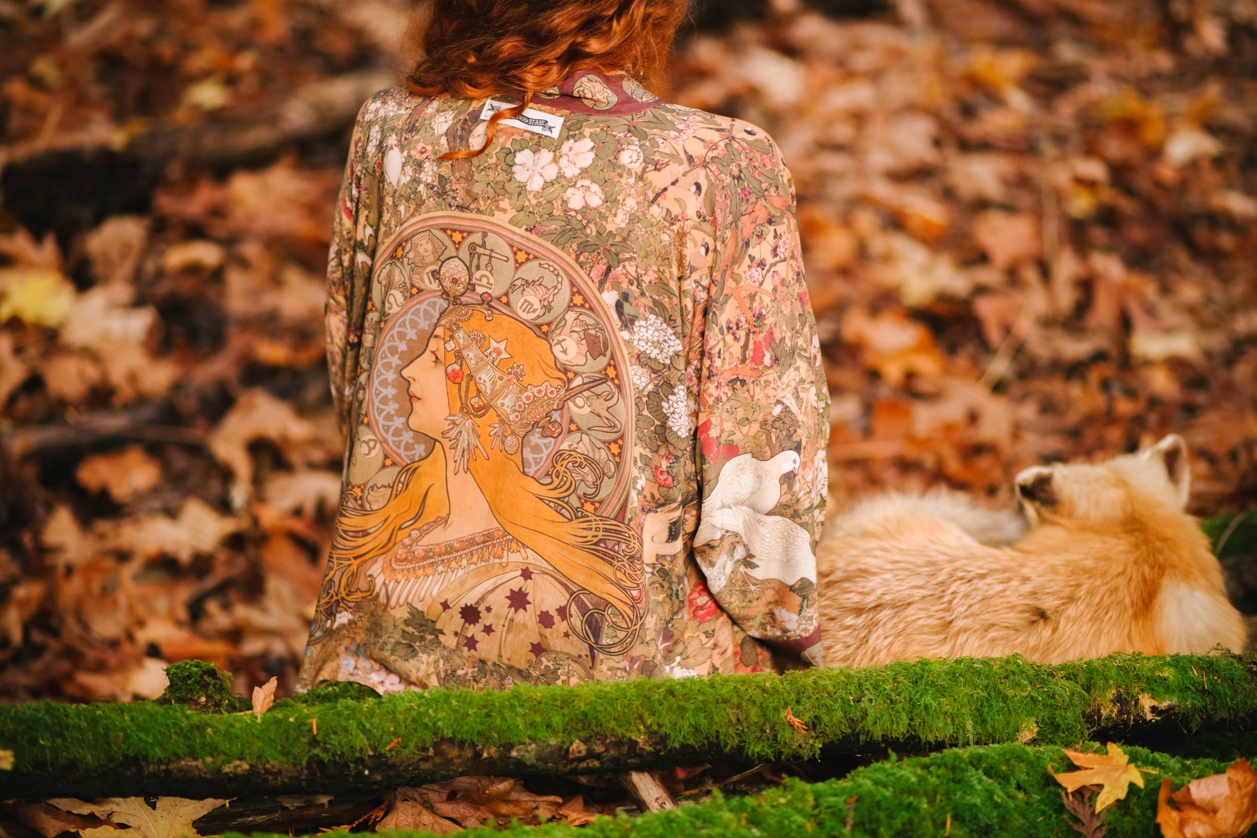 A regal, resplendent celebration of the stories told in the stars, featuring the iconic 1896 Zodiac lithograph by Art Nouveau artist Alphonse Mucha. Mucha’s beloved work features a majestic woman surrounded by the by the 12 zodiac signs and adorned in intricate celestial jewellery. We added a large star to her remarkable crown. The background comes from an incredible ink-on-silk scroll painting by Ueno Setsugaku, created in the 1860’s. We trimmed this design with Mucha’s zodiac signs on a deep burgundy background. The result is an opulent and elegant take on Mucha’s work, with a nod to the luxe bohemianism of the 1970’s. 100% bamboo/wood viscose.